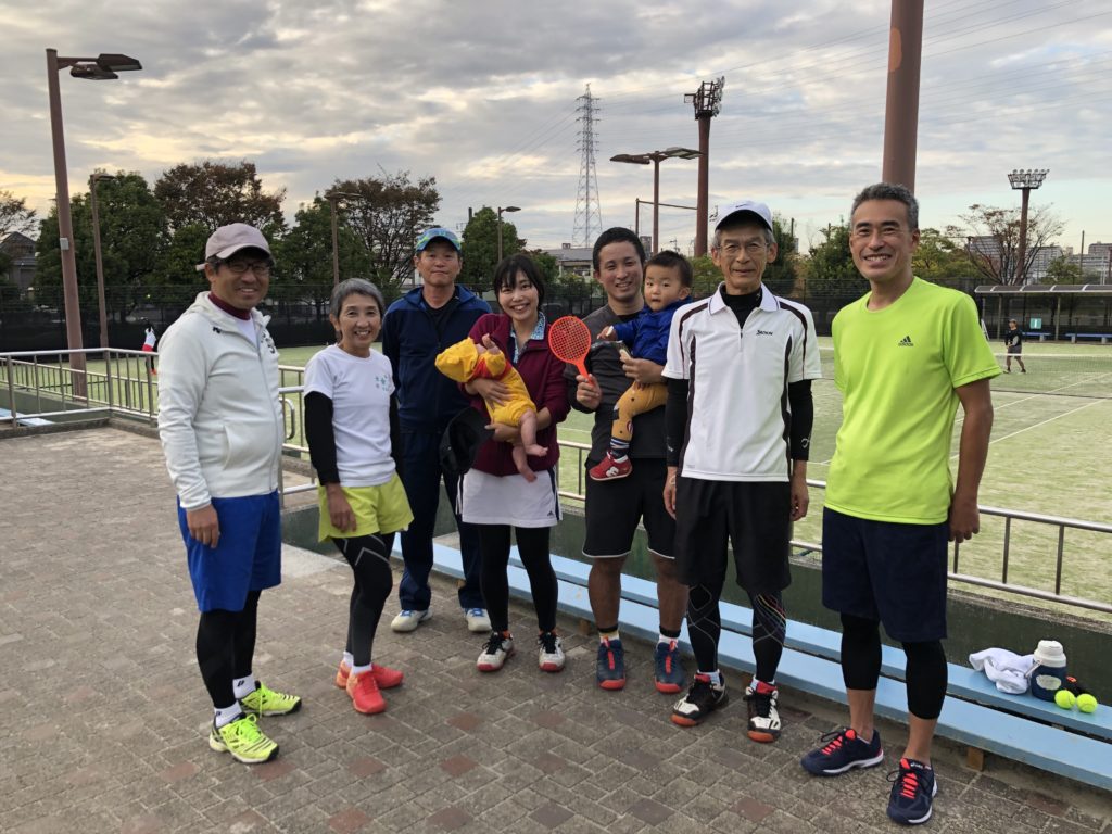 途中から高木さんご夫妻登場により雰囲気一変。高木さんの旦那様は名大テニス部のご出身でかなりの腕前。グリグリ回転系で現代テニス。対してフラット系有する昭和のテニス。試合結果は言わずもがな。一方コート外では2歳弱の右に左に駆け回る元気な男の子にジジ・ババが右往左往。ベビーカーでお淑やかに眠っていた生後2か月の女の子も途中から元気全開。
