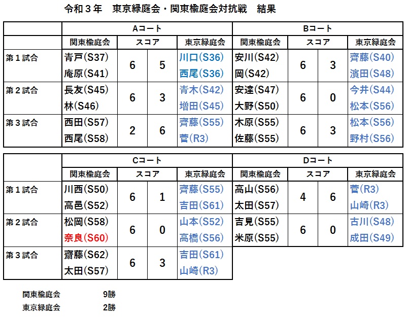 2年ぶりに東京緑庭会との交歓テニス会が2021年11月28日(日)東宝調布スポーツパークにて行われました。関東楡庭会からは19名(仙台からS55吉見)のほか応援のS46勇崎・S49桑田・S49安達、北海道楡庭会からS57太田幹事長、関西楡庭会からもS46林会長が参加されました。東京緑庭会からは18名(うち令和3年卒2名)の参加となりました。なおテニス終了後の全体の懇親会はコロナ事情を配慮し行ないませんでした。