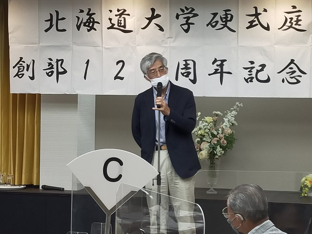 祝賀会は大野楡庭会会長の挨拶で始まり、来賓のご挨拶として、東北大学萩庭会幹事長渡辺様、小樽商科大学北海道緑庭会会長谷口様より祝賀のご挨拶をいただいた。両大学から北大との長きにわたりライバルとして切磋琢磨してきたことや、東北、北海道地区を共に牽引してきたことのお話があった。