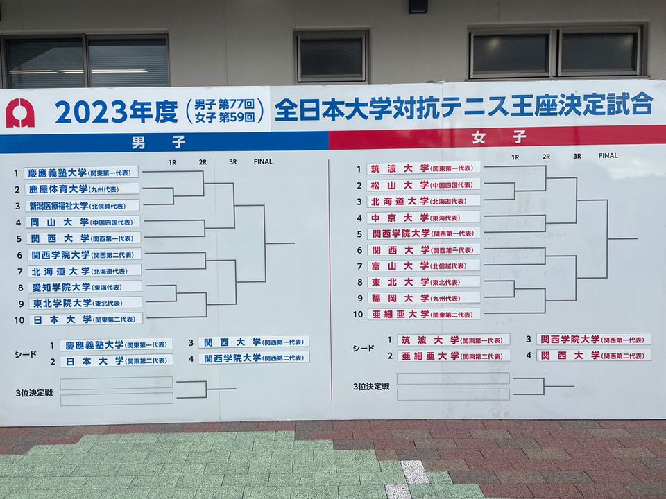 大学テニスの日本一を決める団体戦「2023年度全日本大学対抗テニス王座決定試合(男子77回/女子59回)」(愛媛県松山市・愛媛県総合運動公園テニスコート/9月29日~10月4日/ハードコート)が開幕し、競技初日は男女1回戦(各2対戦)が行われた。 大学王座は地域リーグを勝ち抜いた男女各10校が集い、男子が複3+単6の計9ポイント、女子は複2+単3の計5ポイントのトーナメント制で団体戦を戦う。https://tennismagazine.jp/article/detail/25856
