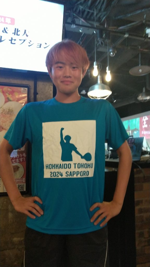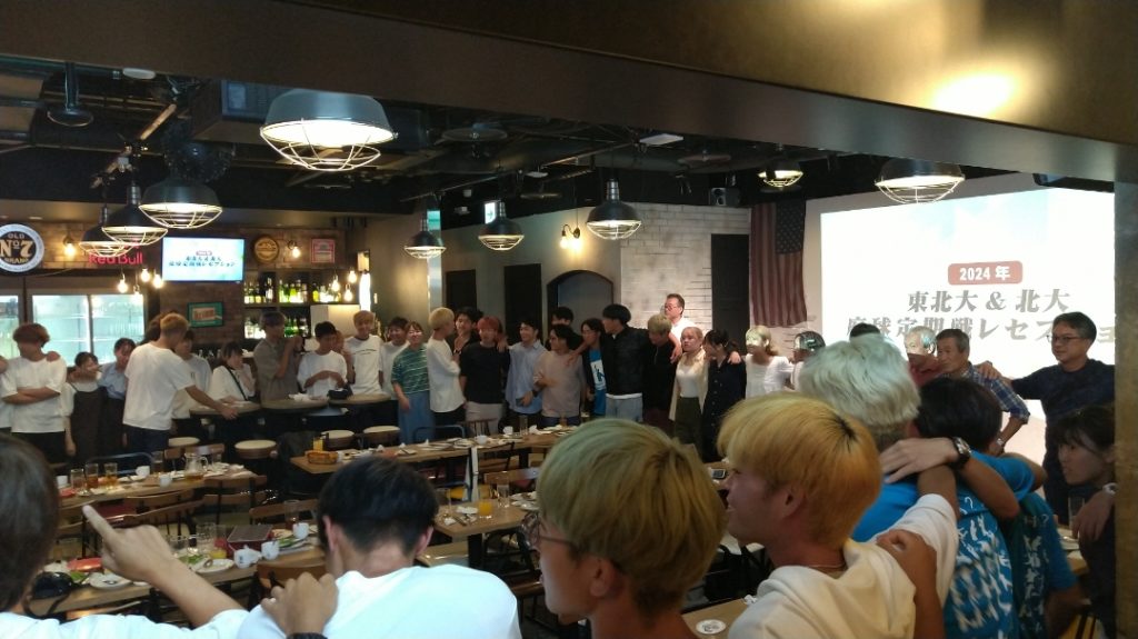 北大キャプテンの宮原君の司会で、和やかに進行しました。前方の大きなスクリーンに試合の写真が映し出され、いつものように出場選手が、試合の状況を面白く語って盛り上がりました。また、最後に北大学生歌「青葉もゆるこのみちのく」と北大寮歌「都ぞ弥生」を全員でしっかり歌って盛り上がりました。