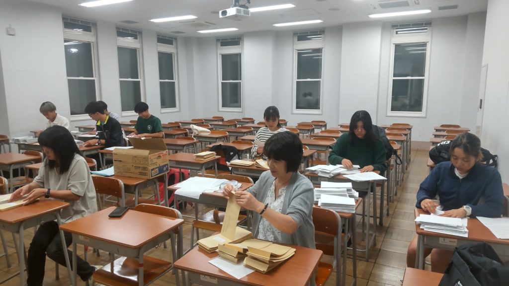 OBOG約600人に要請文を郵送しますが、10月4日、前部長の岩渕教授に農学部の教室をお借りして発送作業を行いました。